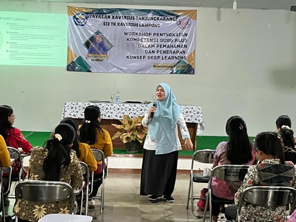 Bandar Lampung – Selasa, 8 Juli 2025 TK Xaverius Kotabumi mengikuti kegiatan workshop peningkatan kompetensi guru dengan tema “Memahami dan Menerapkan Konsep Deep Learning” yang dihadiri oleh seluruh TK Xaverius se-Lampung. Workshop ini dipandu oleh narasumber ahli, Ibu Apriyani, S.Pd.